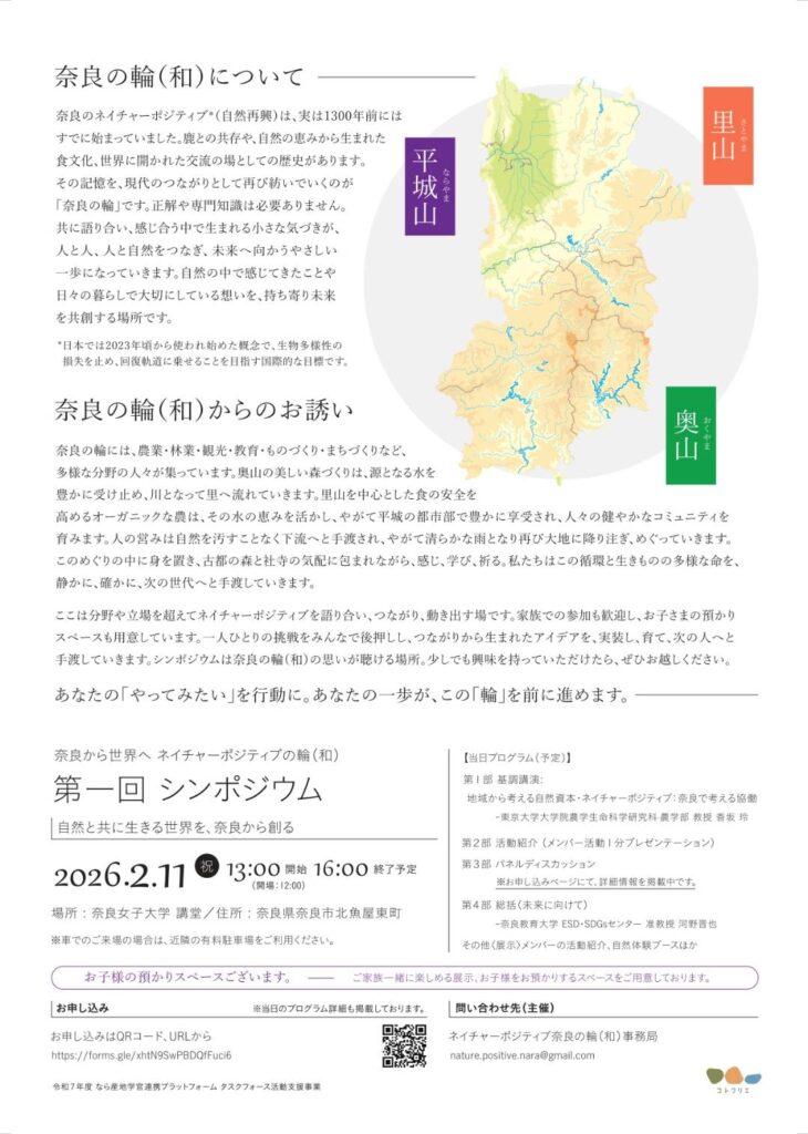このたび、「自然と共に生きる世界を、奈良から創る」をテーマに、奈良から世界へネイチャーポジティブの輪(和)(なら産地学官連携プラットフォームのタスクフォース)のシンポジウムを開催いたします。