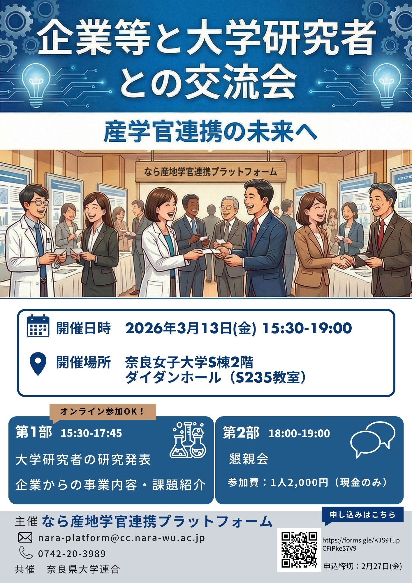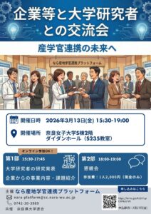 なら産地学官連携プラットフォームでは、企業等と大学研究者との連携を促進することを目的として、「企業等と大学研究者との交流会」を下記のとおり開催します。