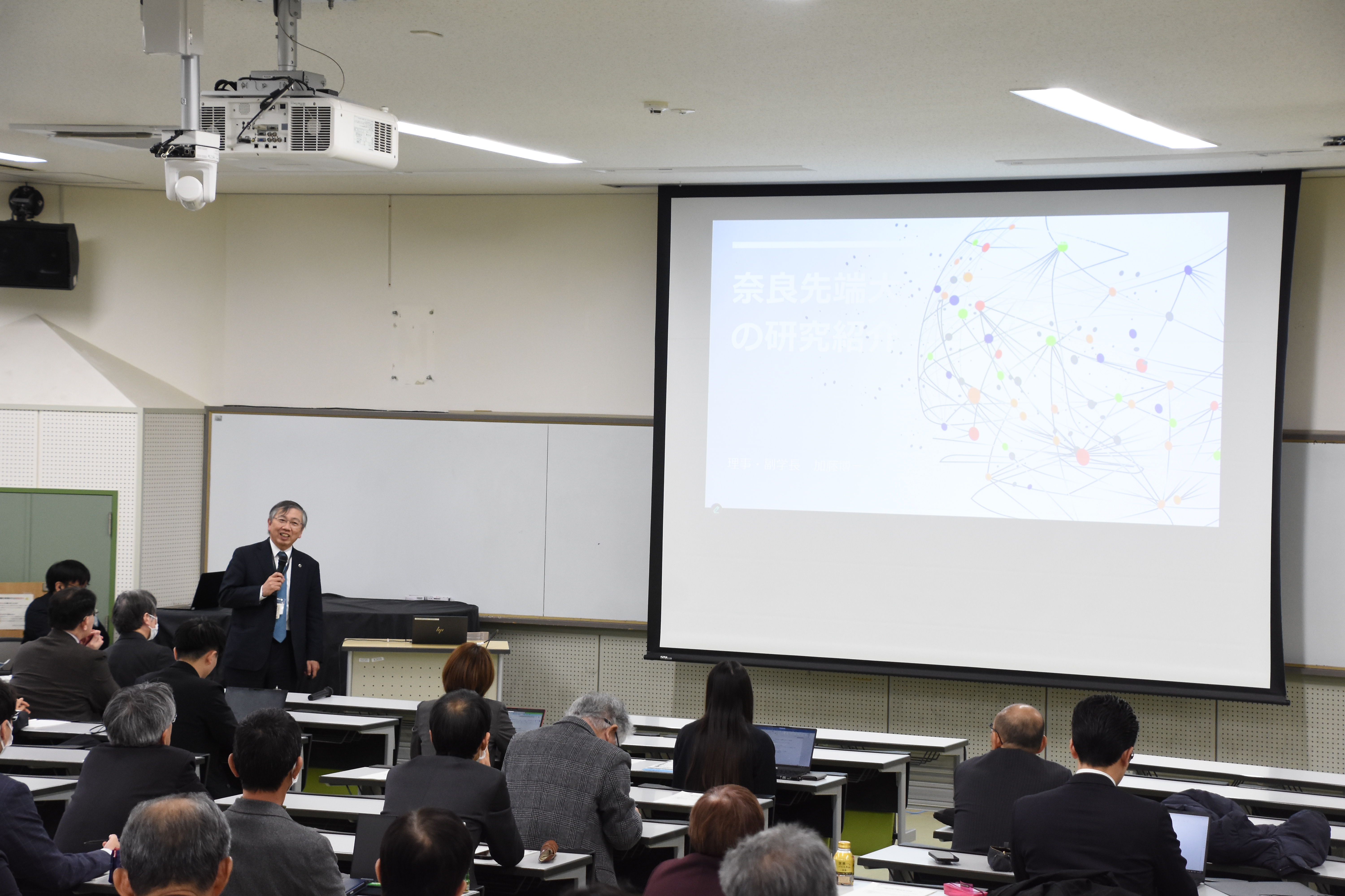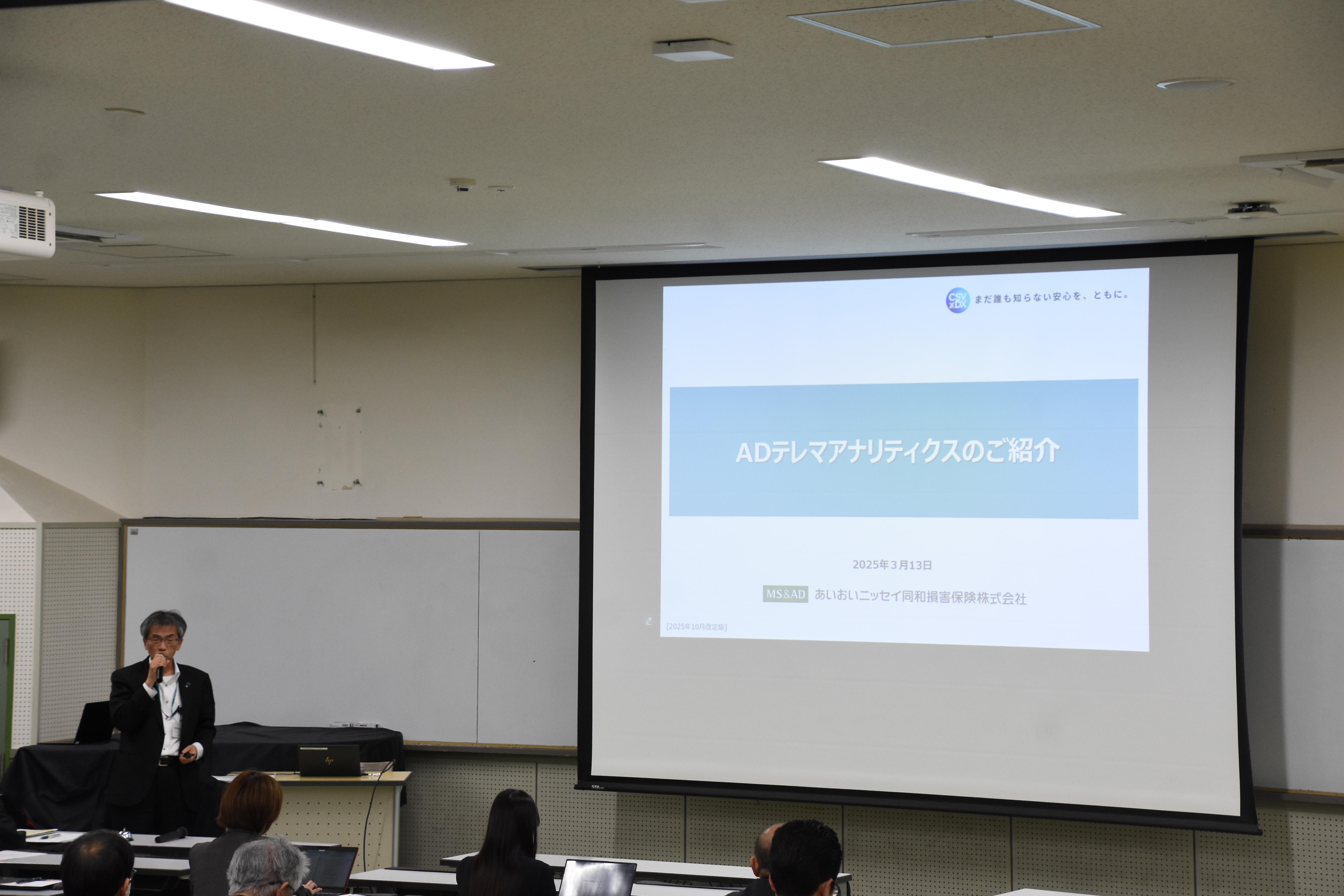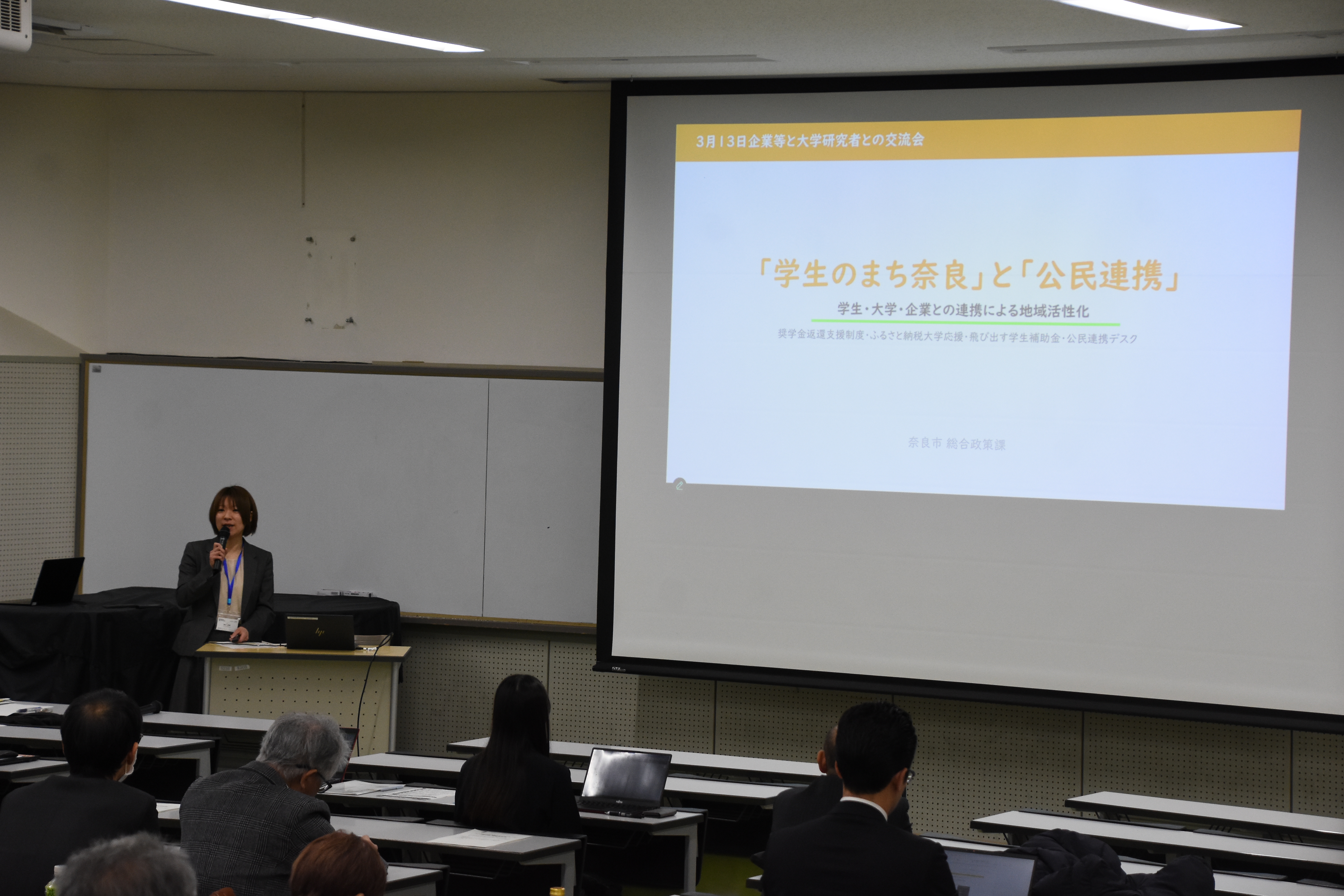 また、奈良市役所とあいおいニッセイ同和損害保険株式会社から、事業内容や課題についての発表があり、研究者との連携に向けた具体的なテーマについて情報共有が行われました。