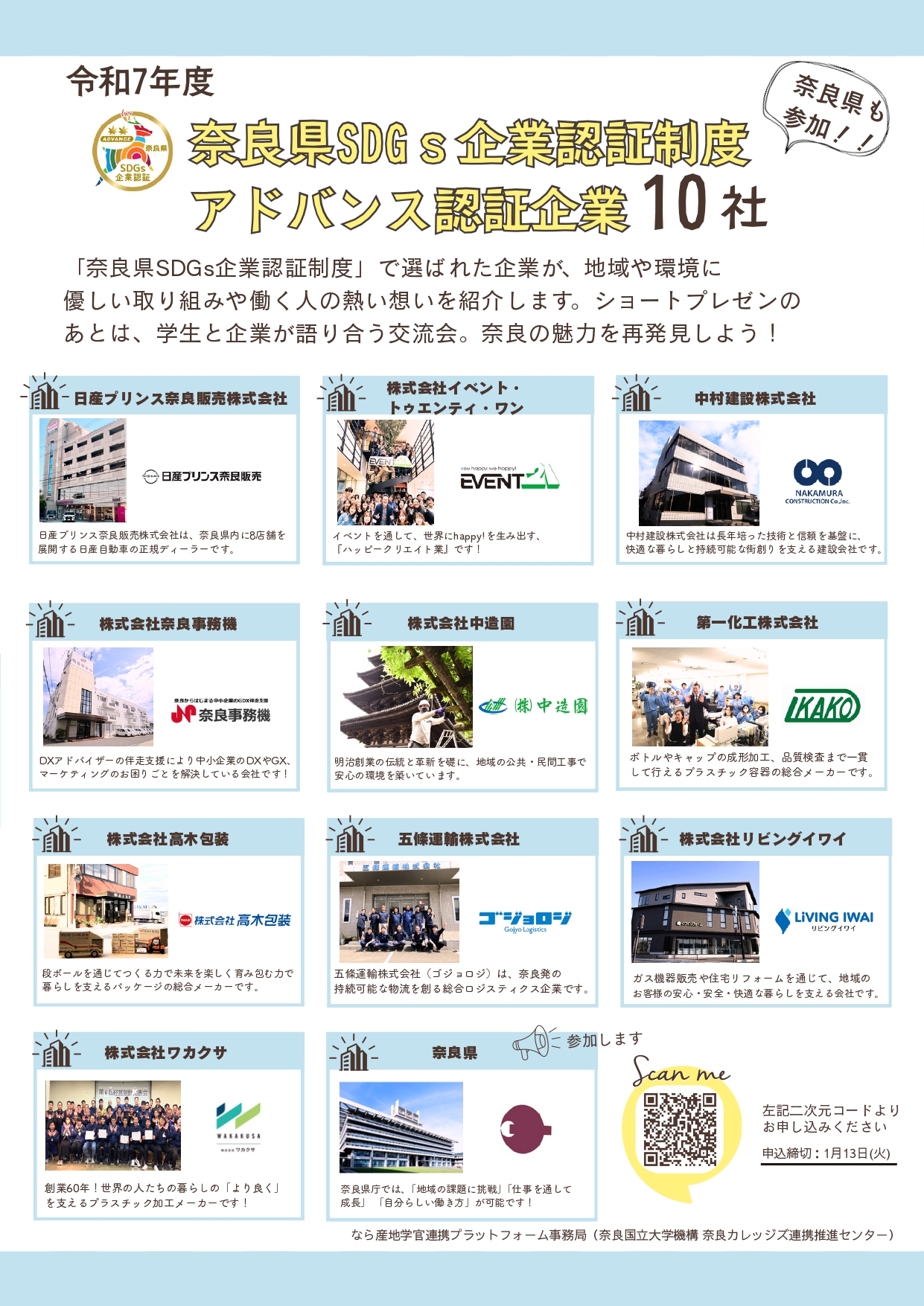 今回は、「令和7年度奈良県SDGs企業認証制度」において、アドバンス認証を取得した企業10社と、制度を創設した奈良県が参加します。