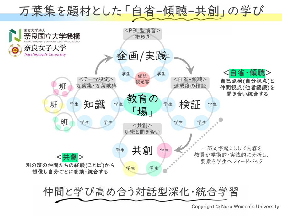 本プロジェクトは、奈良の歴史や文化を象徴する『万葉集』を出発点とし、地域への学びを深め、“自省”・“傾聴”・“共創”により 統合的な実践知を育む探究型教養教育です。