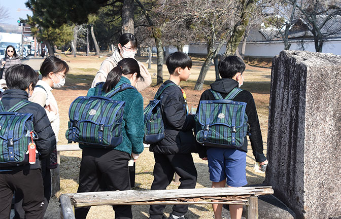 学生が作成した、奈良女子大学周辺の万葉歌碑を巡る観光ルートをもとに奈良女子大学附属小学校の児童を案内する街歩きを実施した。