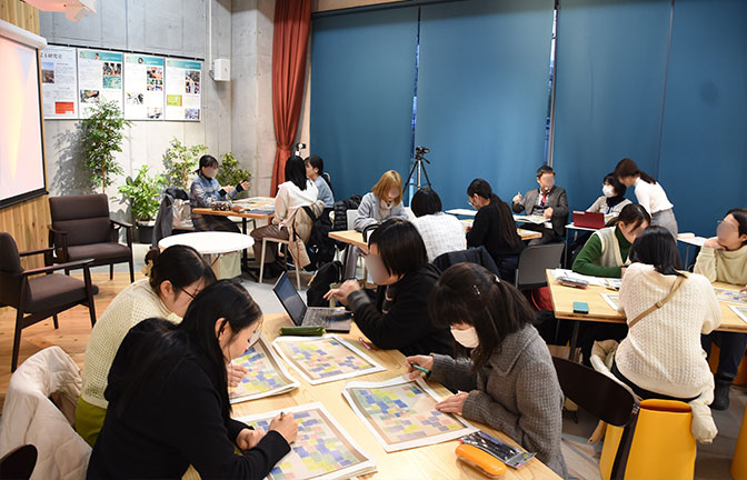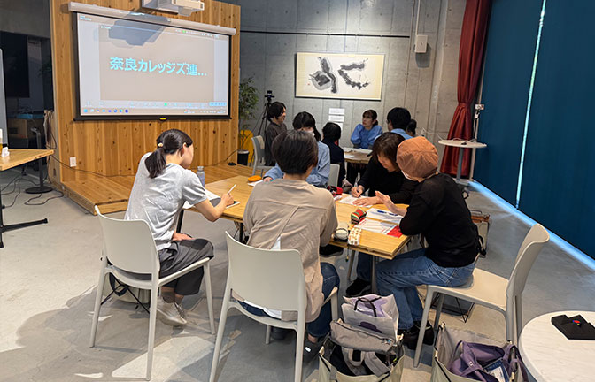 奈良女子大学文学部と連携し、墨運堂の奥田氏を講師に招き、「気持ちをこめて墨で書く・描く」と題して社会人向けの講座を実施しました。文化財や伝統の技を守り継ぐためにはどうすればよいか、受講者同士で意見交換を行いました。