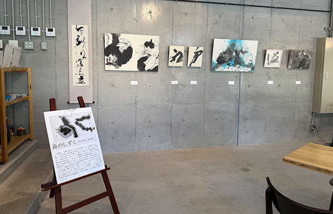 奈良カレッジズ交流テラスにて、墨運堂の奥田氏の個展「森のしずく」を開催しました。会場には約20点の作品が展示され、学生、機構教職員、地域住民が鑑賞に訪れました。