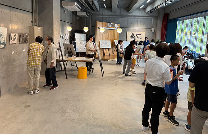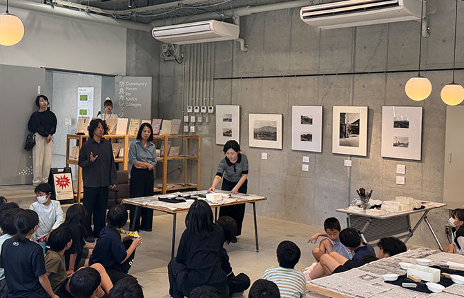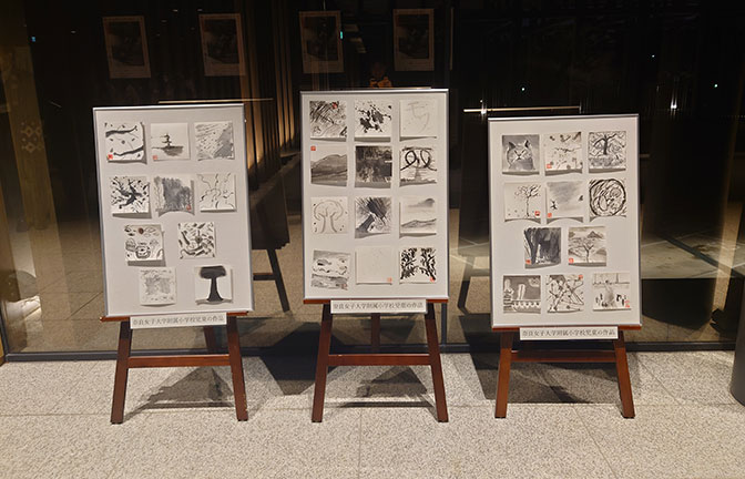 7/11の授業「奈良の墨づくり」にて作成した書道作品を、奈良国立大学機構奈良カレッジズ交流テラスに展示した。児童の作品のほか、株式会社墨運堂社員兼書道アーティストの奥田氏の作品を展示した。児童らは参観で訪れた父兄とともに作品を鑑賞した。