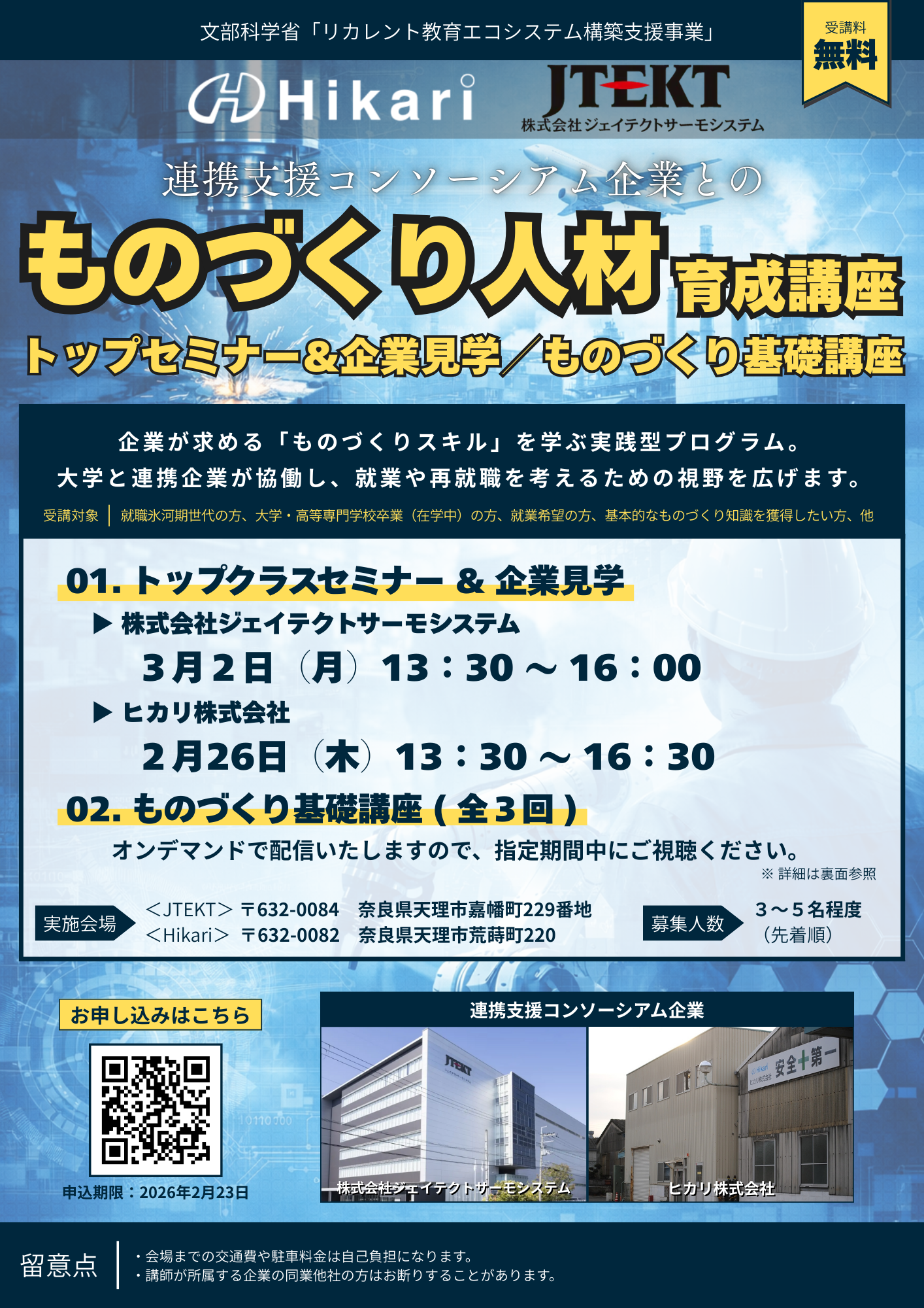 本講座は、企業が現場で本当に求めている「ものづくりスキル」を、実践を通して学ぶプログラムです。大学と連携支援コンソーシアム参画企業であるヒカリ株式会社、株式会社ジェイテクトサーが協働し、ものづくりの現場に触れながら、就業や再就職に向けた視野を広げる機会を提供します。各企業への訪問・見学を通じて、仕事のリアルを体感できるほか、基礎から学べる「ものづくり基礎講座」をオンデマンド形式で全3回開講。自分のペースで学びながら、次の一歩につながる実践力を身につけることができます。